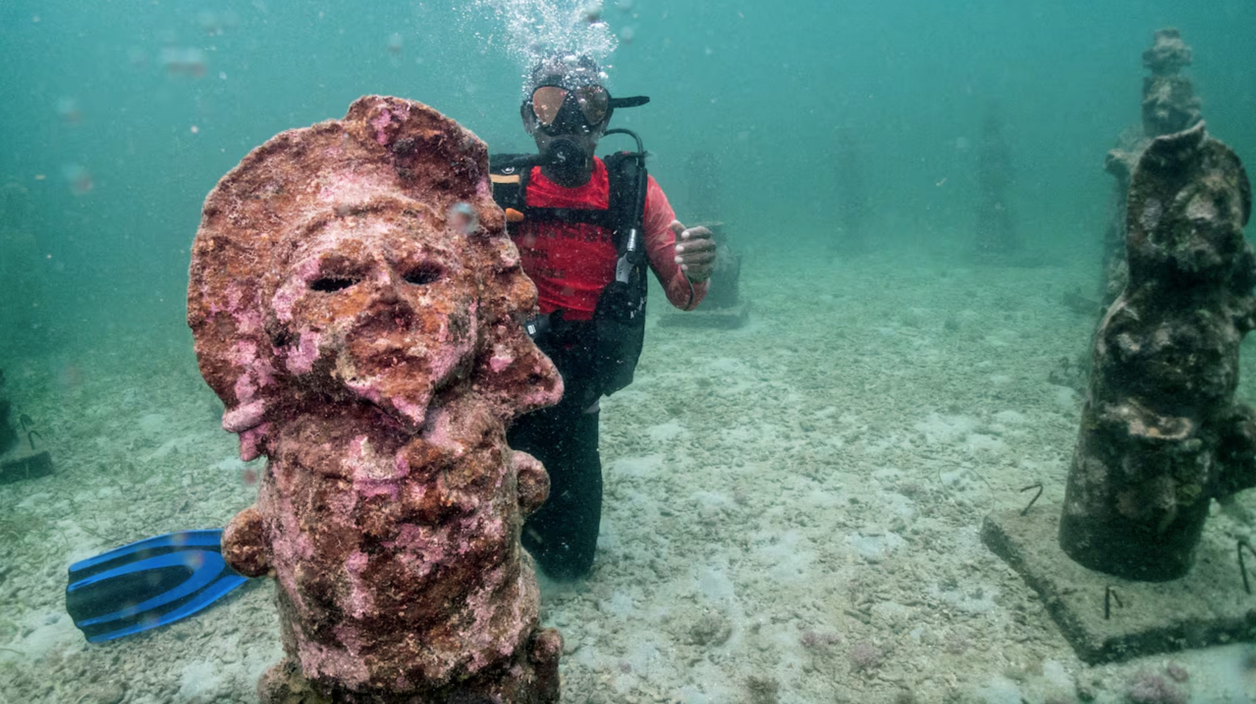 Las esculturas, diseñadas en estilo precolombino y cubiertas de coral, parecen restos de un naufragio milenario.